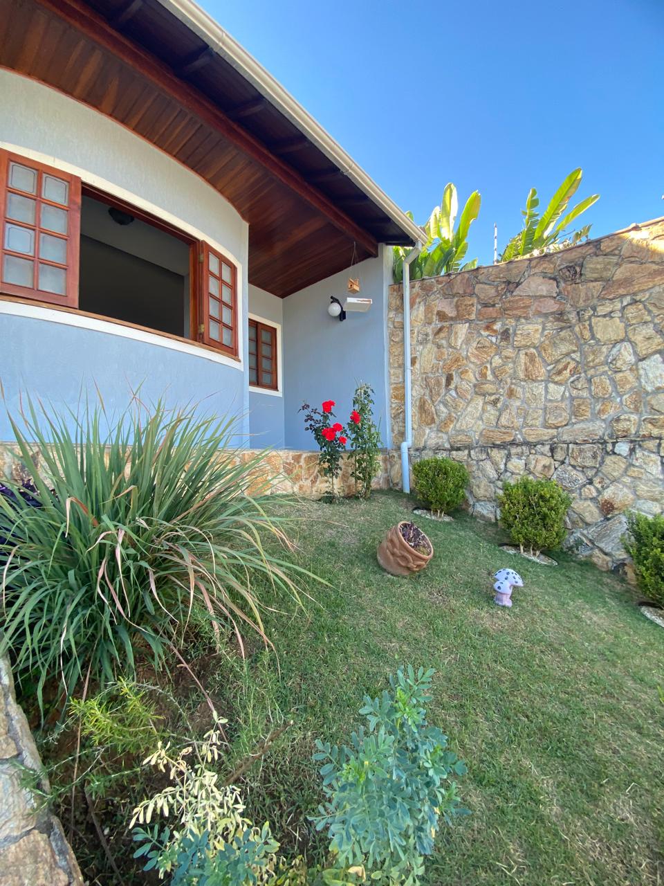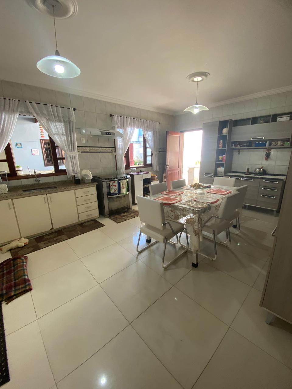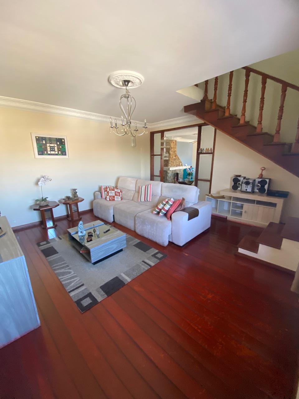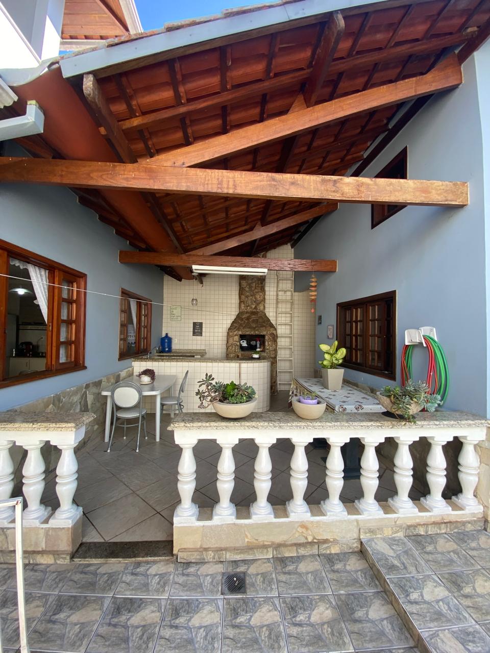 Contém 3 quartos sendo 1 suíte, banheiro social, sala de estar com lareira, sala de TV, copa, cozinha, terraço, área de serviço, área de lazer com churrasqueira, ducha e piscina, quarto e banheiro de serviço, jardim de inverno, quintal, jardim, varanda, garagem para 3 carros.
